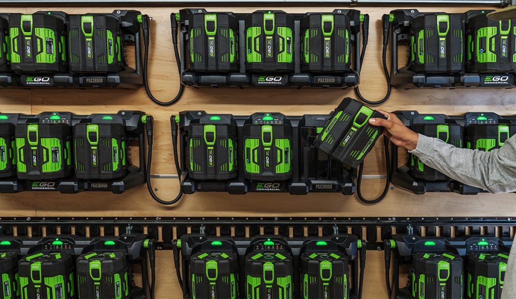 The EGO PGX™ Commercial Charging System also makes a huge difference for fleet management. You can charge up to 70 batteries overnight from a standard outlet, meaning a full set of tools is ready to go by morning.